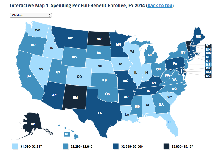 For example, according to data from the Kaiser Family Foundation (Table 2), states with lower than average spending for children in FY 2014 were: Alabama, California, Colorado, Florida, Hawaii, Idaho, Illinois, Indiana, Iowa, Kansas, Louisiana, Michigan, Mississippi, Nebraska, Nevada, New Jersey, North Carolina, Ohio, South Carolina, South Dakota, Utah, Washington, West Virginia, Wisconsin, and Wyoming.