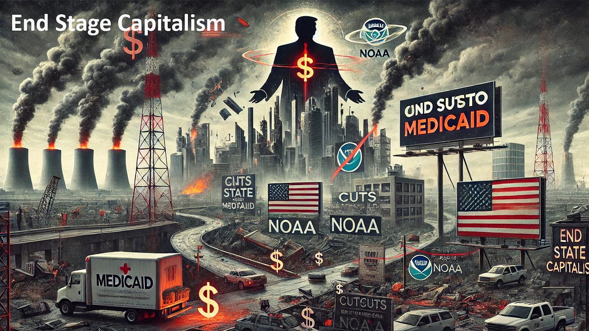 Most policies that Trump attempts to implement, such as cuts to Medicaid, NOAA, and more, have an End-Stage Capitalism component.