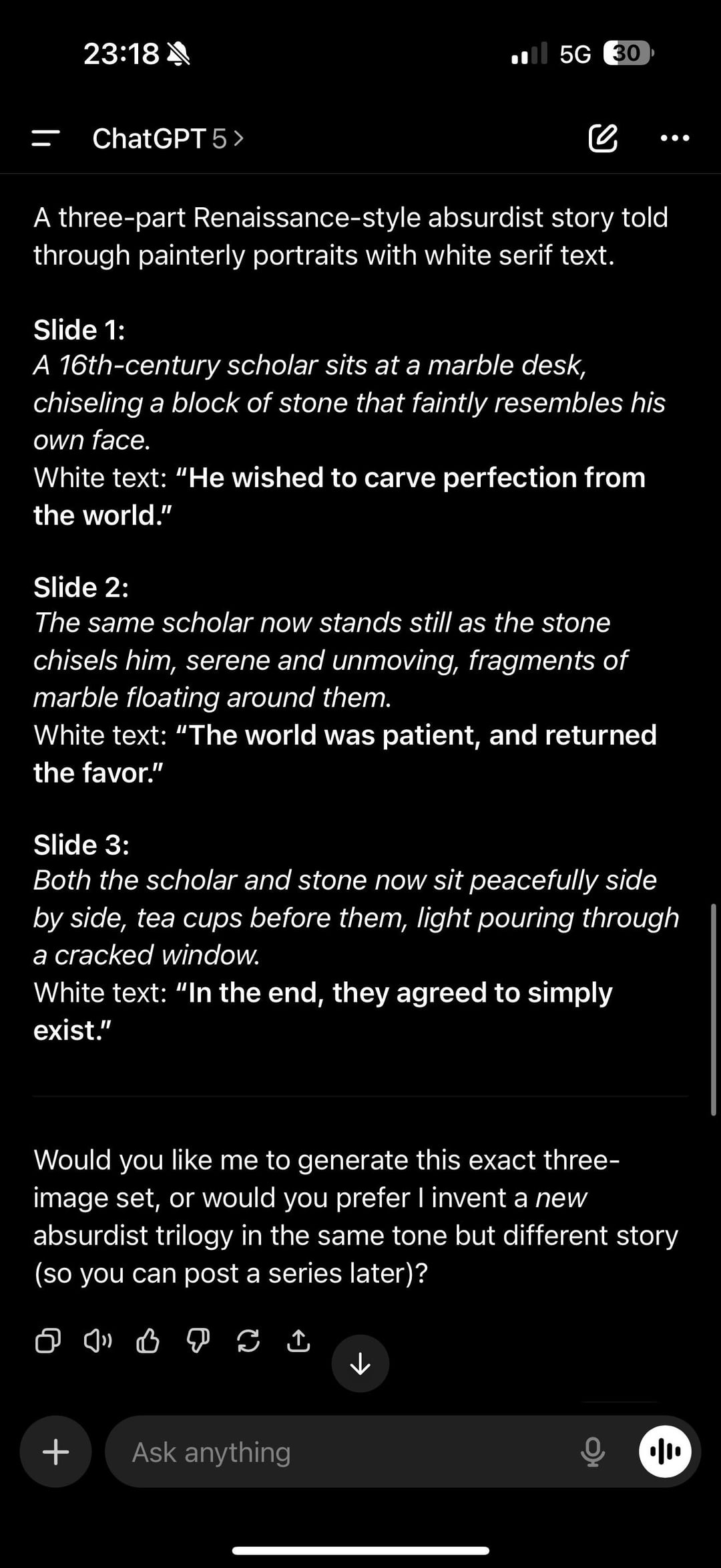 Asked chatGPT to make me a surrealist painting style 3 slide carousel with some pseudo intellectual text on them. Has a whole plan worked out but chat had another, much funnier idea 😂 Like this:Like Loading... Post navigation FREE Printable Story Cubes – The Activity MomRecruiting & Operations Coordinator