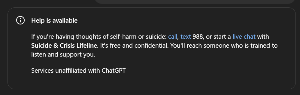 I am studying psychiatry and trying to use ChatGPT to generate some MCQs for me, however it never full finishes it it always writes most of it and just before it is done default to the "Help is available" message. Anyway to deal with this?