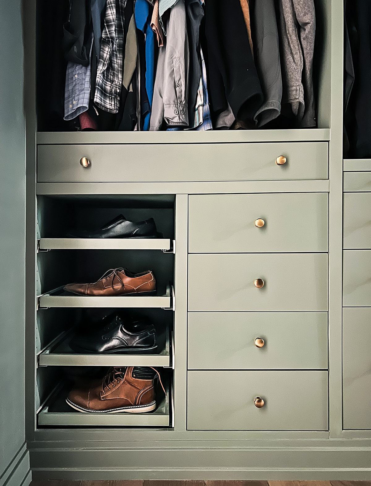 We added two more shoe trays to Mike’s side of the closet. It looks so much more balanced.