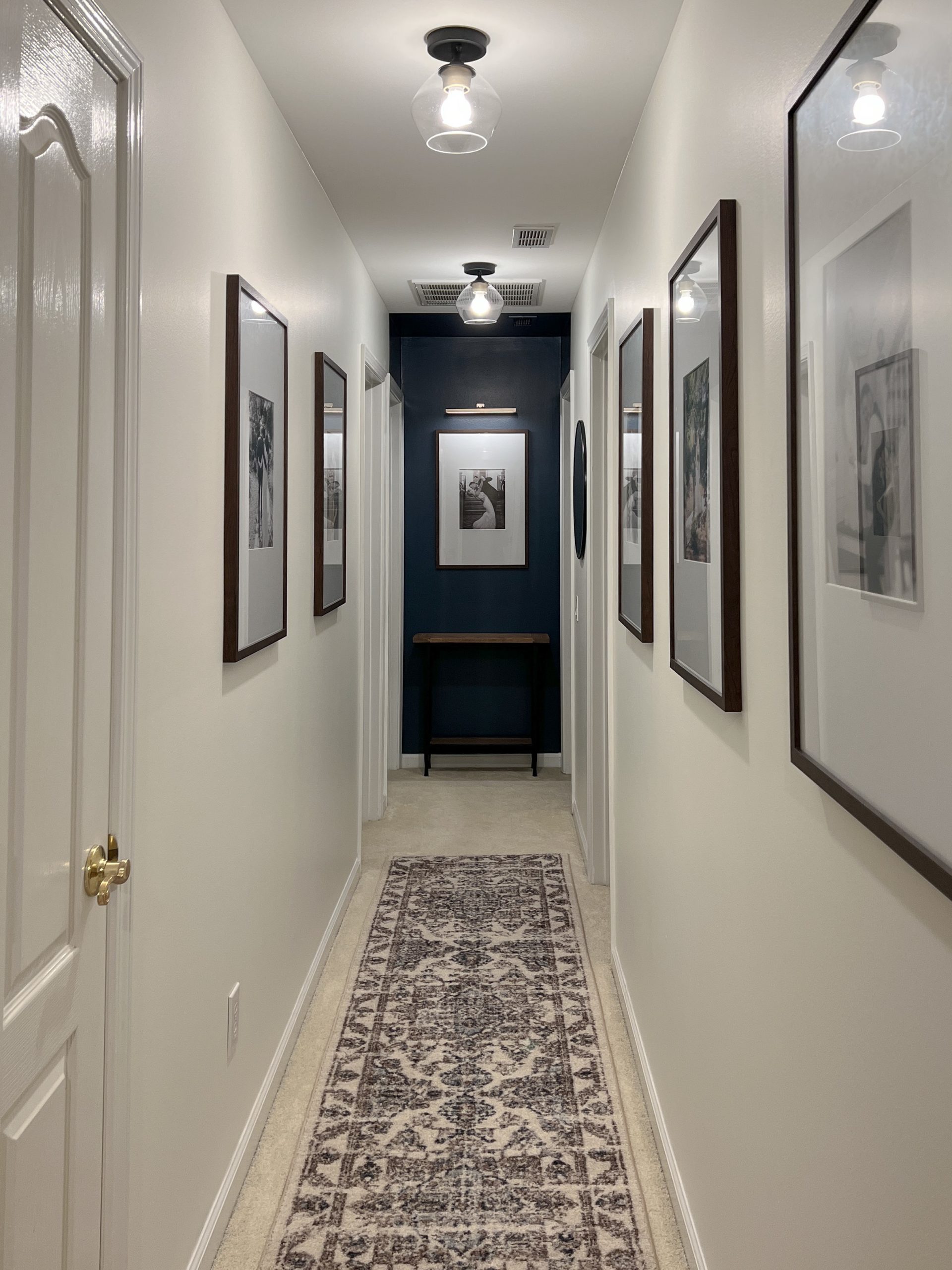 When planning my long hallway refresh, I knew I wanted to paint a dark accent wall at the end. This would shorten the space and also add a pop of color. I went down the rabbit hole of Pinterest (as evidenced above) and decided to do something a little bit different. I came up with a few options- the standard one wall accent and then some arched designs. None of the designs felt quite right.