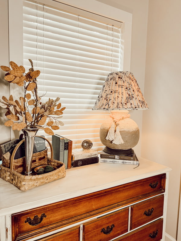 The DIY fabric lampshade adds a warm and cozy feeling to the bedroom. I’m looking forward to changing the bedding give the entire room an update.