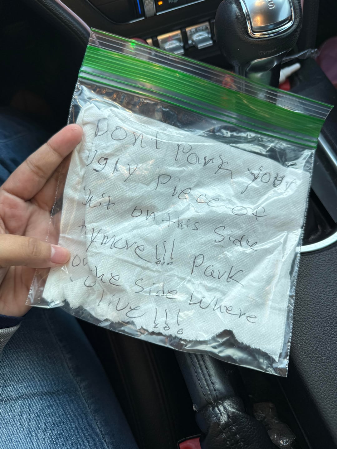 I posted a picture of a note I received on my car Tuesday 12/02. I parked in the same spot maybe 2 days in a row? Then I stopped parking there and parked In the same lot, all week long. It’s unassigned parking in an apartment complex. (Before anyone says I’m parking in someone’s street infront of their house, I’m NOT)