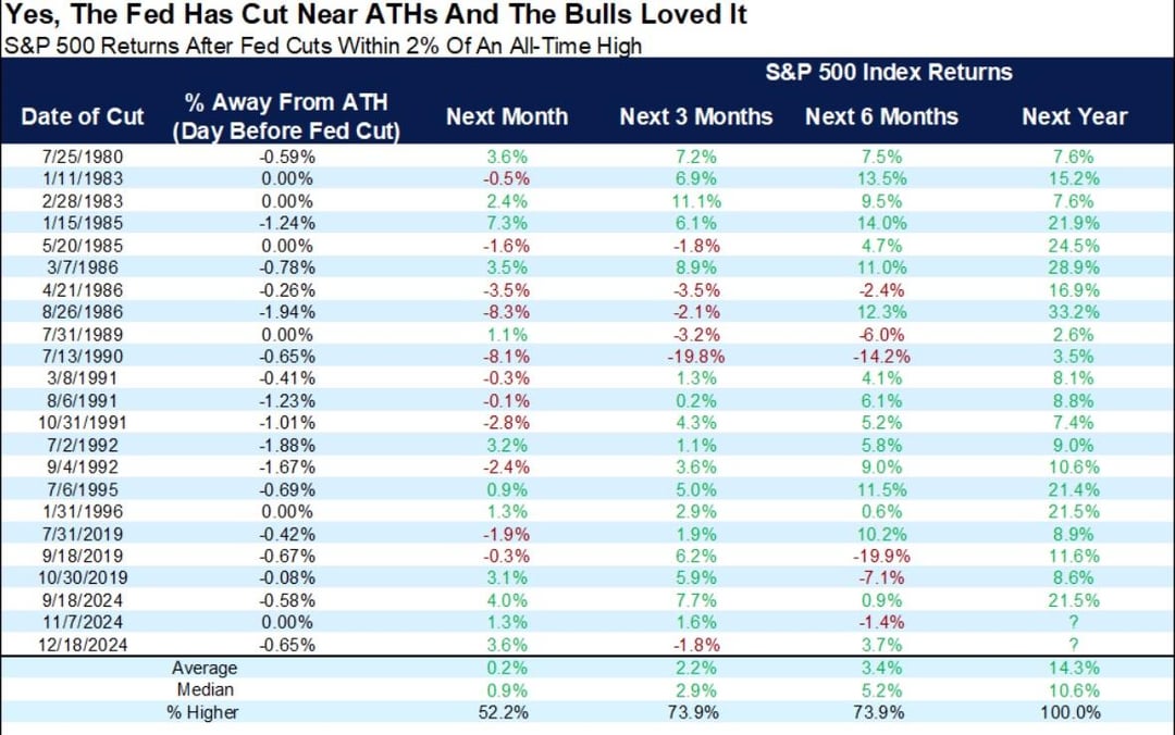 The second piece of data is the s&p performance a year from a rate cut. Out of 21 times the Fed has cut rates, if the s&p 500 was near 2% of ATH (likely to be the case on Wednesday) the s&p 500 was also positive a year later, 21/21 times.
