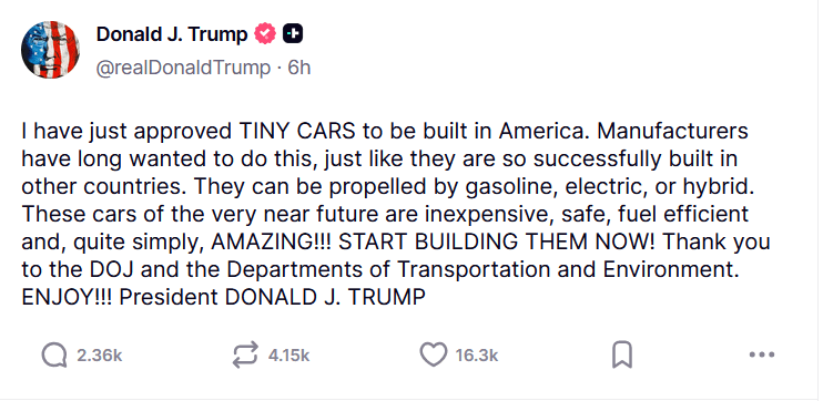 Imagine getting your brand new Dodge Glaciermelter, lovingly decorating it with your first Let's go Brandon bumper sticker, and then reading this about tiny, possibly electric or hybrid cars being amazing now.