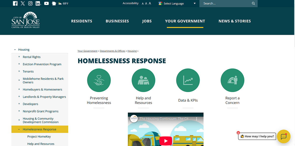 The “Homelessness Response” page on the City of San José’s official site (sanjoseca.gov) is intended to serve several audiences: people currently experiencing homelessness seeking help, advocates or service providers looking for data and policies, concerned residents seeking to understand city efforts, and journalists or researchers. The design of a public-agency site like this must balance accessibility, clarity, trustworthiness, navigability, and comprehensiveness. In this review, I evaluate this page’s strengths and weaknesses across multiple criteria: