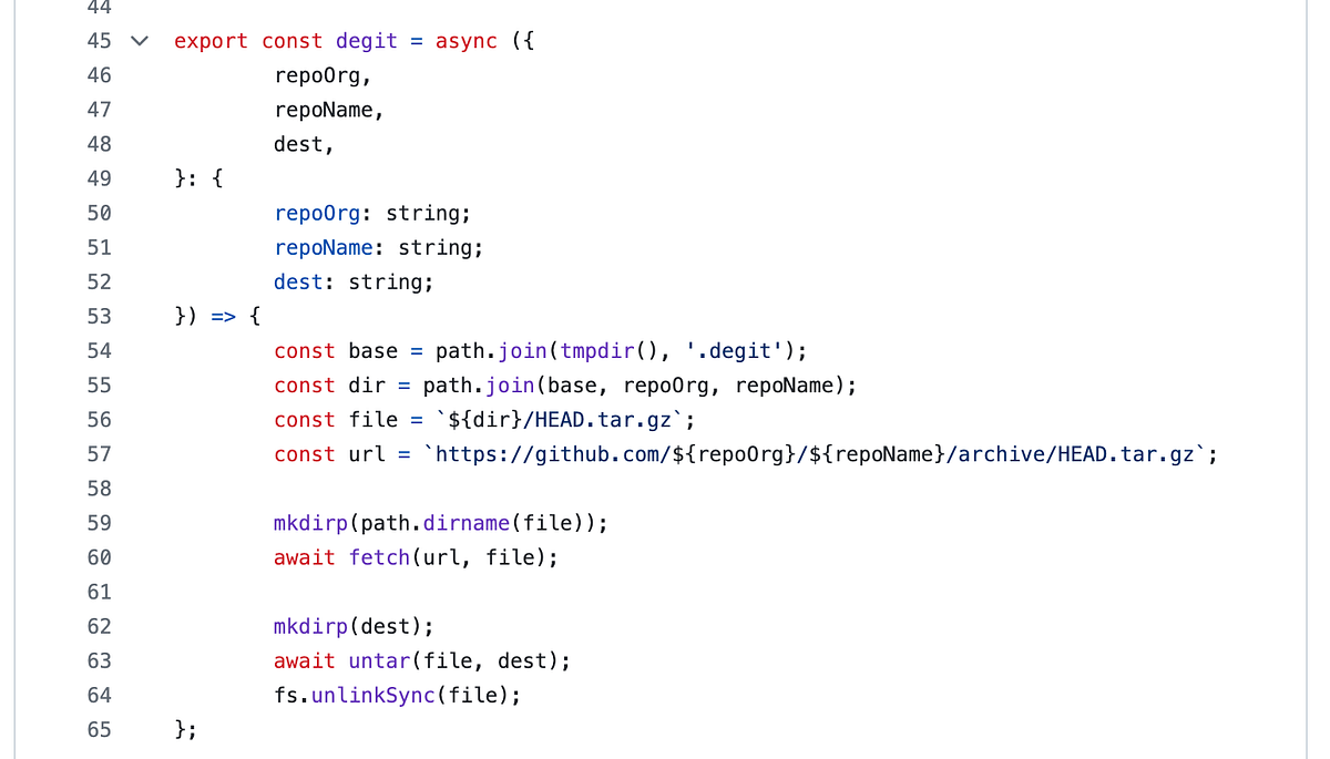 To understand how to build a simple degit function, let’s break down the code from Remotion’s degit.ts file. This file implements a basic version of what the degit npm package does: fetching a GitHub repository’s latest state without downloading the full history.