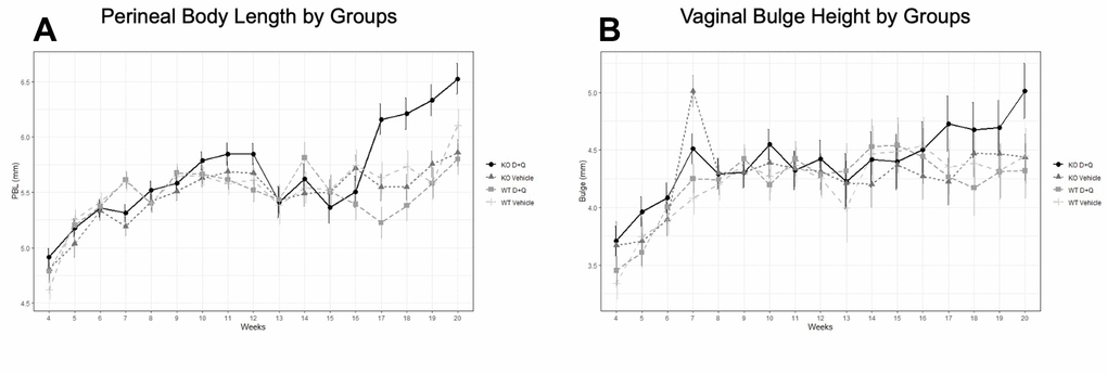 In our clinical assessment of the impact of serial D+Q injections on development of pelvic organ prolapse, no significant differences were seen in vaginal bulge height in either WT or Fbln-5-/- mice receiving D+Q injections compared to control animals. Significant changes did arise in the Fbln-5-/- mice treatment group, in which PBL became significantly longer than that of Fbln-5-/- control and WT control group mice beginning at 18 weeks of age. Importantly, just one animal in the Fbln-5-/- treatment arm had Stage 2 prolapse, with the remainder of mice having predominantly Stage 0 prolapse. Prior studies have shown that >90% of Fbln-5-/- mice will develop prolapse by 24 weeks of age [6].