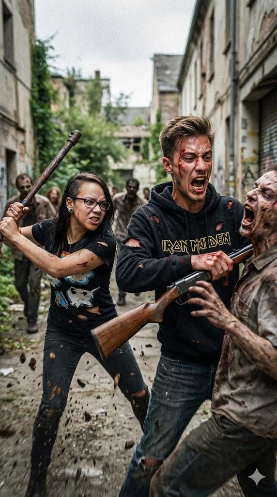 * **Subject B's Action:** She is actively saving him or covering him. Swinging a melee weapon (like a metal pipe or machete) towards the attacker, or firing a pistol point-blank with a fierce expression.