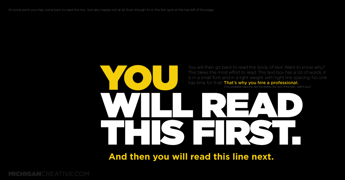 After establishing your bold statement or attention-grabbing piece, select which text needs to be read next, and so on. Organized and structured design elements make the user experience refreshingly easy. Typically, people read from top to bottom and left to right, but that doesn’t mean the information you’d like people to view first needs to be located at the top of the layout or on the left. As a rule, much larger text is typically read first no matter where it’s located. Bodies of smaller text are usually read last, if at all. Only the information at the head-of-the-hierarchy-line is successful in enticing the viewer to continue reading.