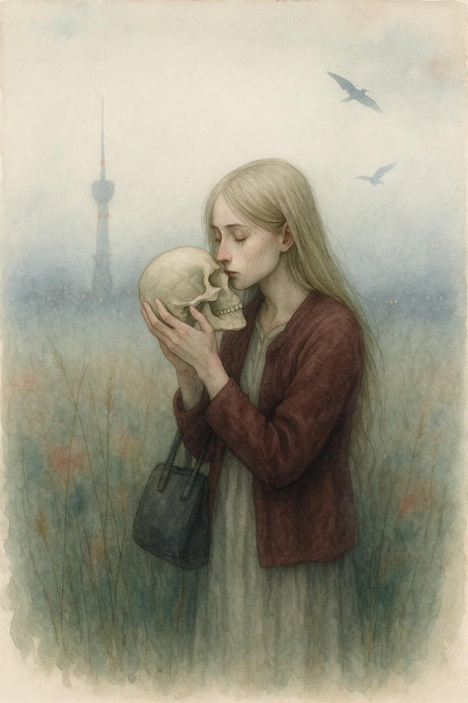Watercolor on textured paper, wet-on-wet washes, soft fog/rain, muted blue-grey palette with tiny warm amber lights; lots of negative space; cinematic melancholy. Slender, subtle faces; gentle soft-focus; slight motion blur on birds/people; wet reflections/puddles; low contrast.