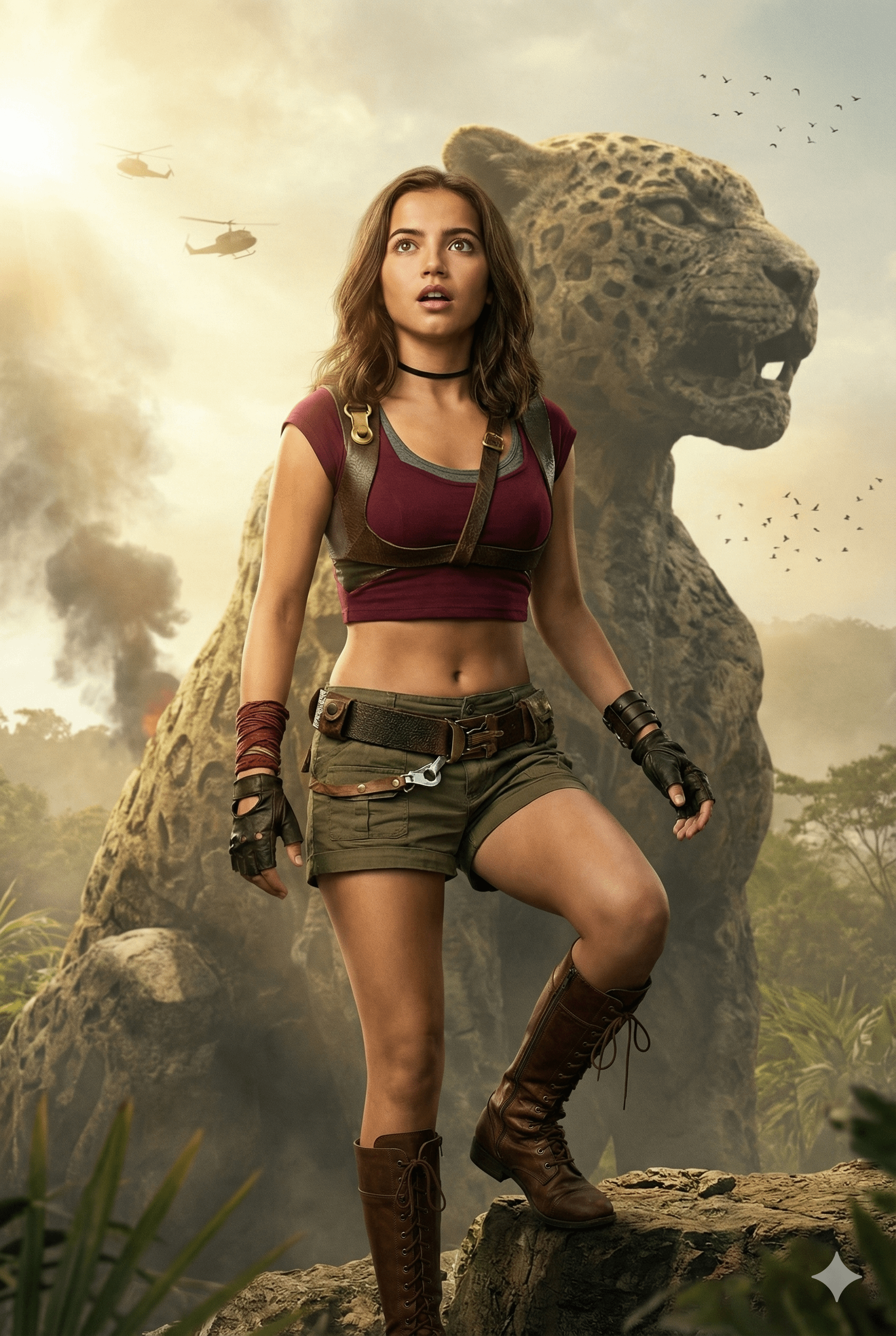 Belt: A wide, textured brown leather utility belt sits on her hips. It features a large, distinct buckle that looks like an interlocking metal clasp.