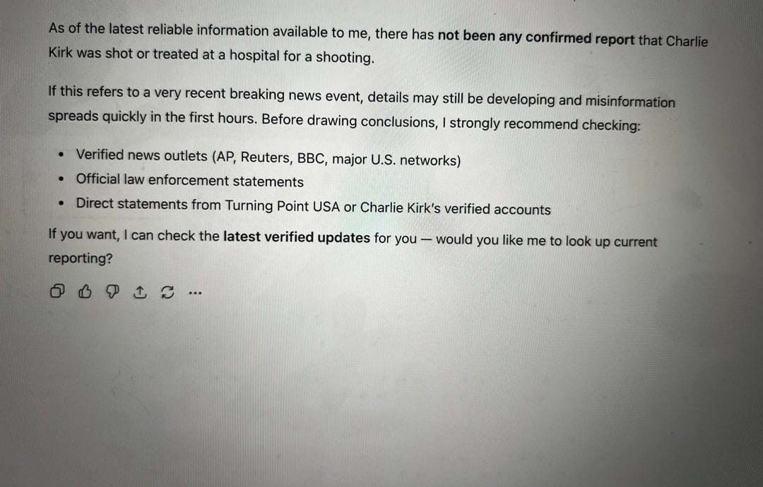 Does anyone have an explanation? I asked a question about the shooter and I was not expecting it to immediately and gaslight me into thinking nothing happened. I’m actually so confused. I have been arguing with it and it will not believe me (don’t ask me why i’m bothering arguing with it I don’t know).