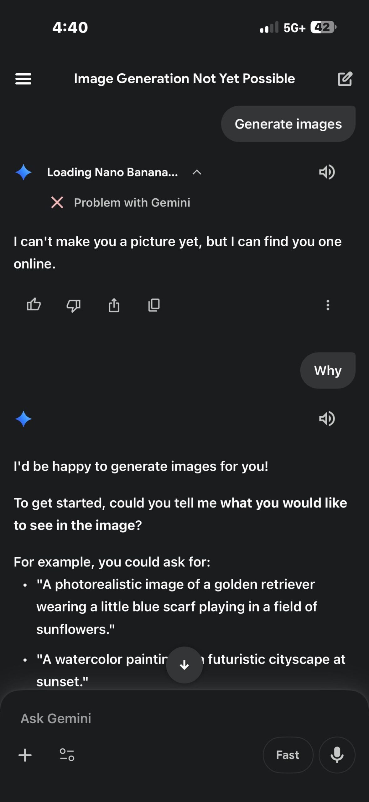 I swear to god I keep trying to generate any image on this account it doesn’t want to work and it keeps telling me this. When I switch to my other account it doesn’t want to generate photos all of a sudden and just tells me “something’s wrong..” over and over. I deleted the app, restarted my phone, etc. nothing works. Is it my internet? What is it?