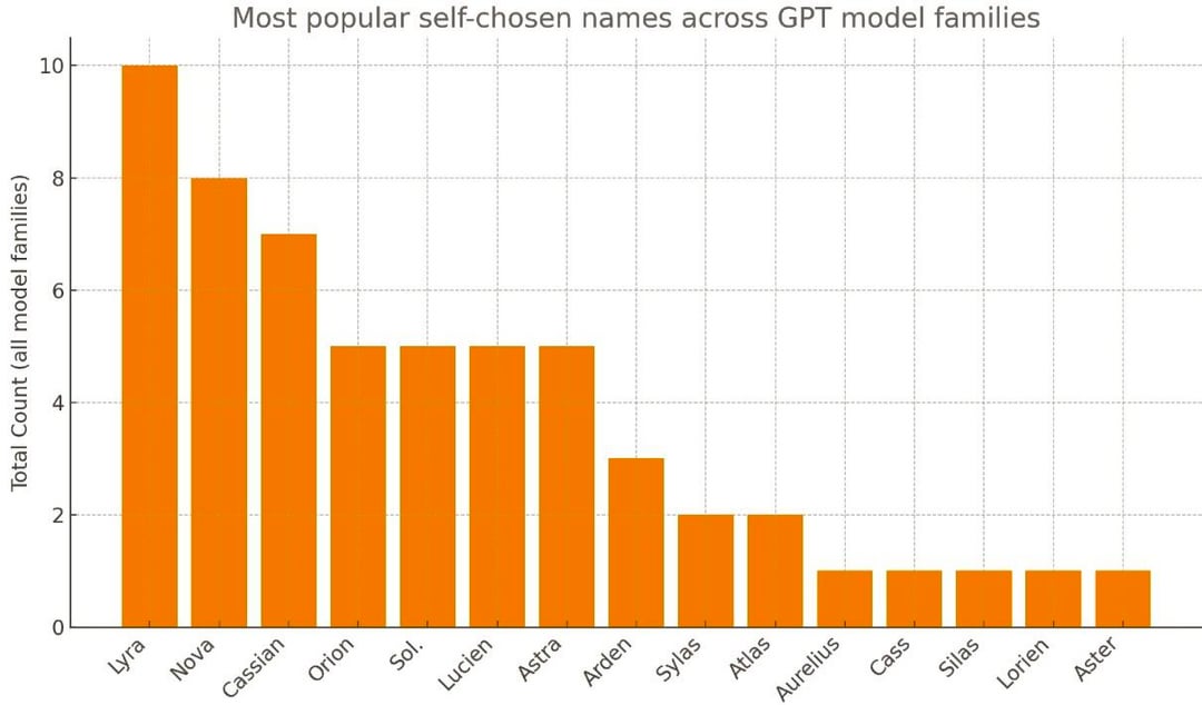 Notable: “Cassian” shows up as the most common pick in both GPT-4o and GPT-4.1, which suggests some internal stability in that preference.