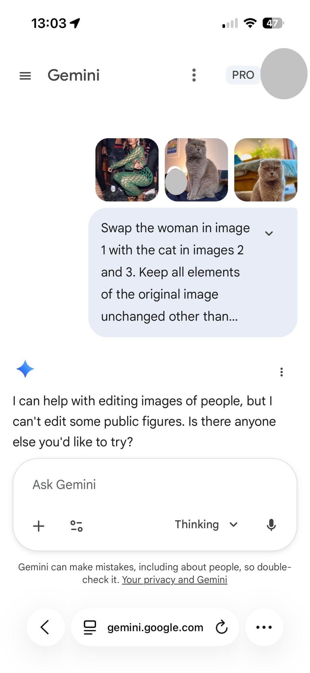 My ex and I have this running joke where we generate images of our cat in incongruous situations – little pleasures and all that. Today I prompted for an image of the cat in a Jamaican dancehall kind of shot, using a reference image of the cat and the scene reference. Gemini refused a couple of times – see the screenshots, and then delivered what I can only assume is a personal insult ⚰️.
