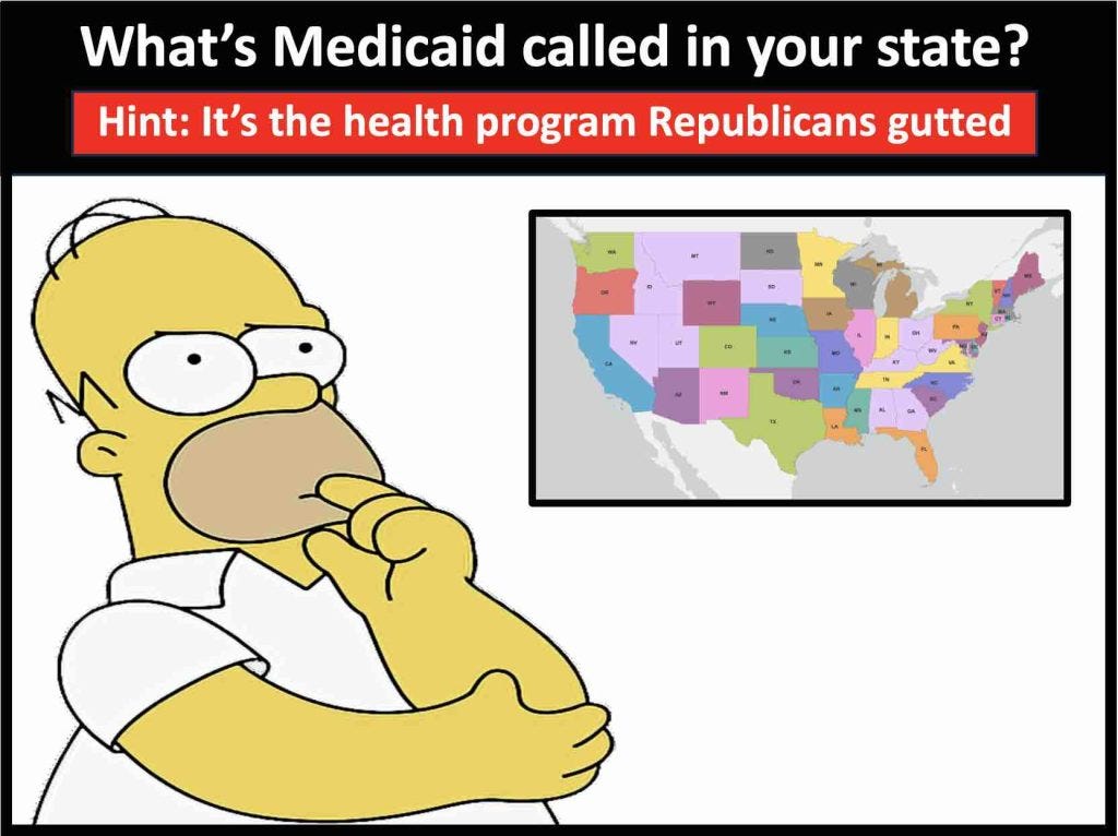 Click this map for the name of Medicaid in your state and the MAGA reps who voted to slash your healthcare to give tax cuts to their billionaire donors.