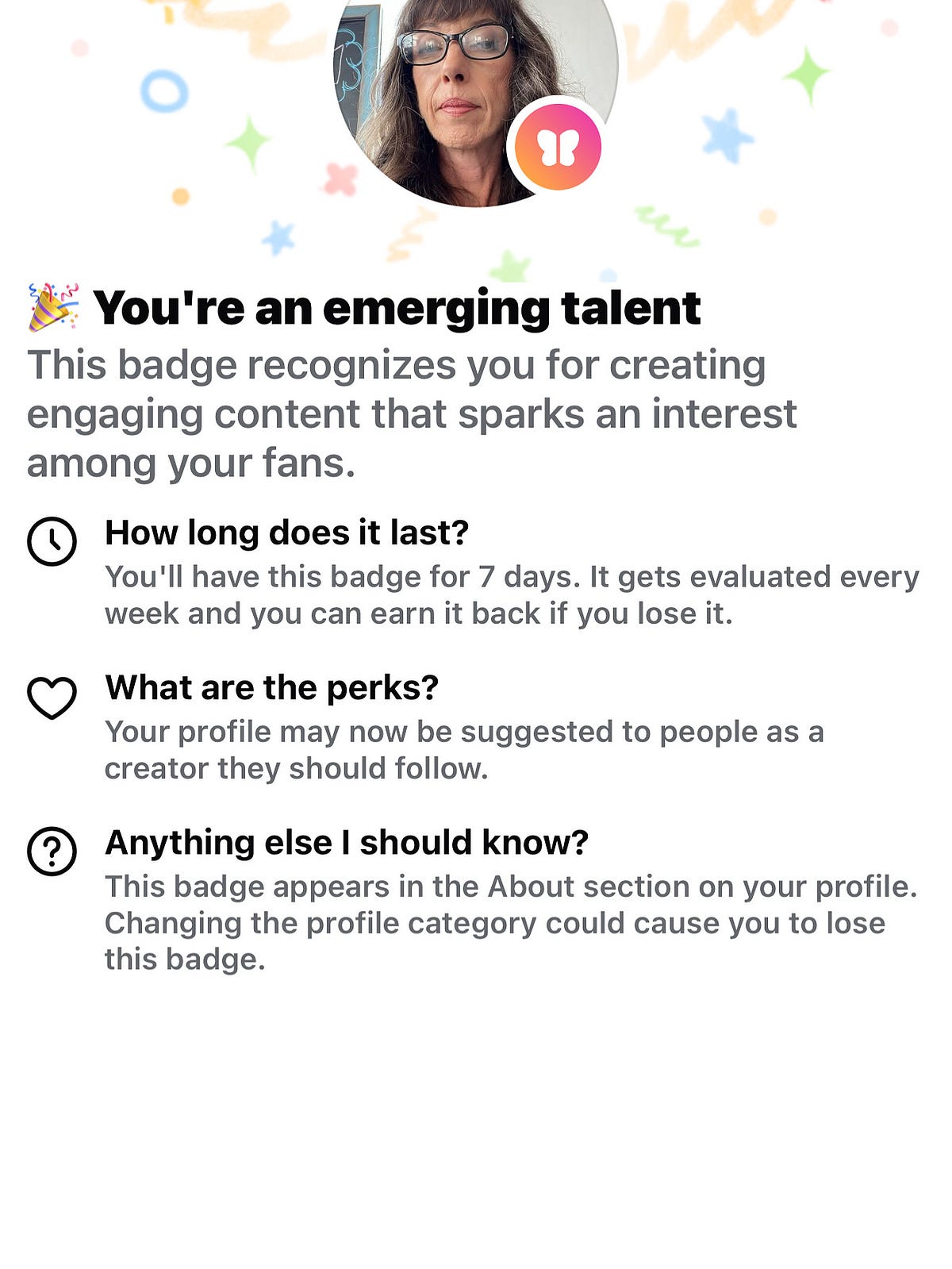 Recently, Facebook notified me twice that thanks to the quality of my posts, it was increasing my reach and even gave me an Emerging Talent badge. I was never a Girl Scout, so these Facebook badges might be the only ones I collect.
