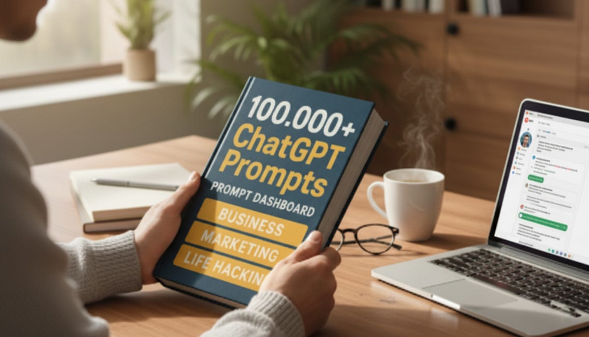 A person’s hands holding a book titled “100,000+ ChatGPT Prompts” on a desk with a laptop.