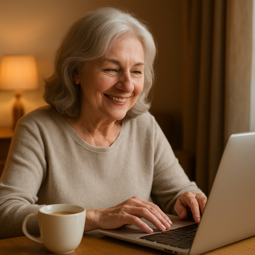 Senior woman smiling softly at her laptop, warm light on her face, cup of tea nearby.