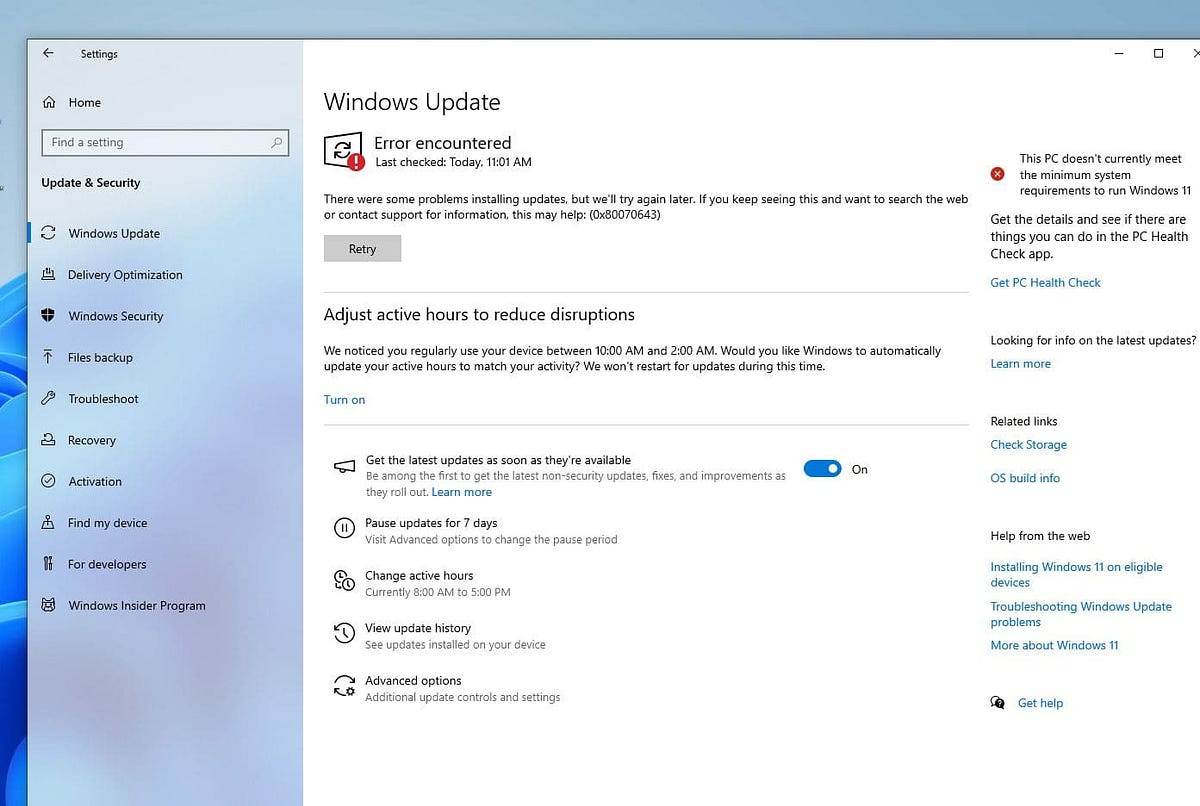Even after the system restarts, Users encounter an error message stating, “There were some problems installing updates, but we’ll try again later. If you keep seeing this and want to search the web or contact support for information, this may help: (0x80070643).”