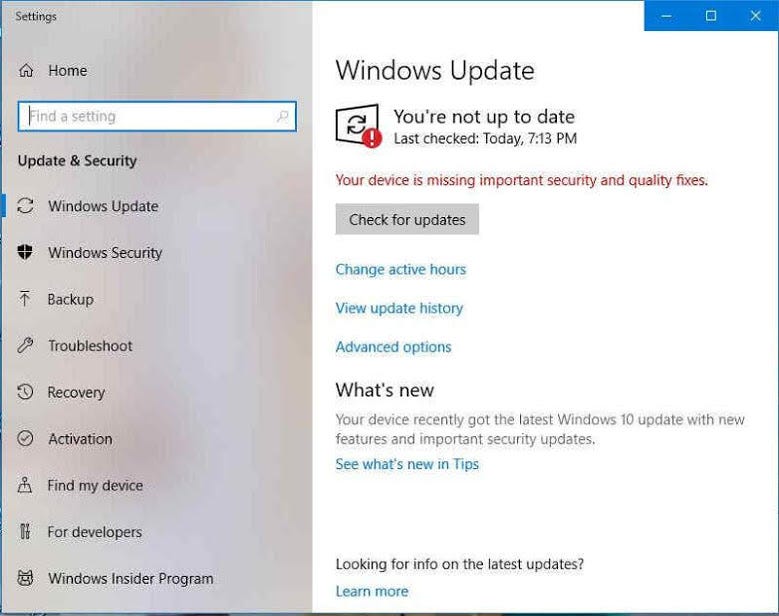 Windows 10 unable to perform Windows Update with error “Your device is missing important security and quality fixes.”, after clicking on “Check for updates” button still showing “You’re not up to date” message with same error message.