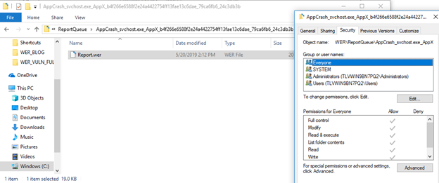 เมื่อ Windows พบปัญหาระบบล่มหรือล้มเหลว ระบบจะทำการสร้างไฟล์ Report.wer INI และจัดเก็บรายงานข้อผิดพลาดไว้ภายใต้ไดเรกทอรี ReportQueue ( C: \ ProgramData \ Microsoft \ Windows \ WER \ ReportQueue ) ซึ่งแต่ละรายงานจะได้รับไดเรกทอรีย่อยของตนเองและผู้ใช้ทุกคนมีสิทธิ์เข้าถึงไฟล์และสามารถเขียนไฟล์ได้ตามภาพประกอบที่ 1