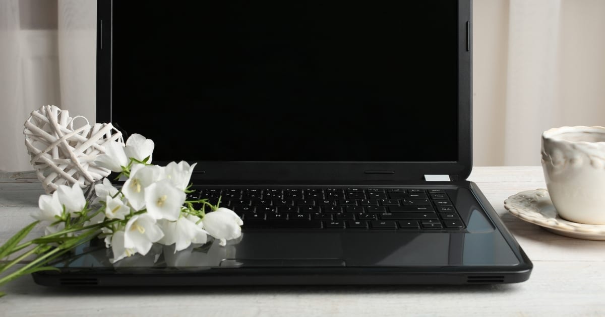 Desk with laptop and flowers