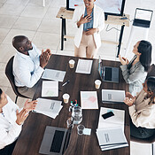 Work presentation, woman presenter and applause from business people in a conference room meeting. Happy, teamwork and collaboration of a office training team cheering for female workshop leader – Stock Photo