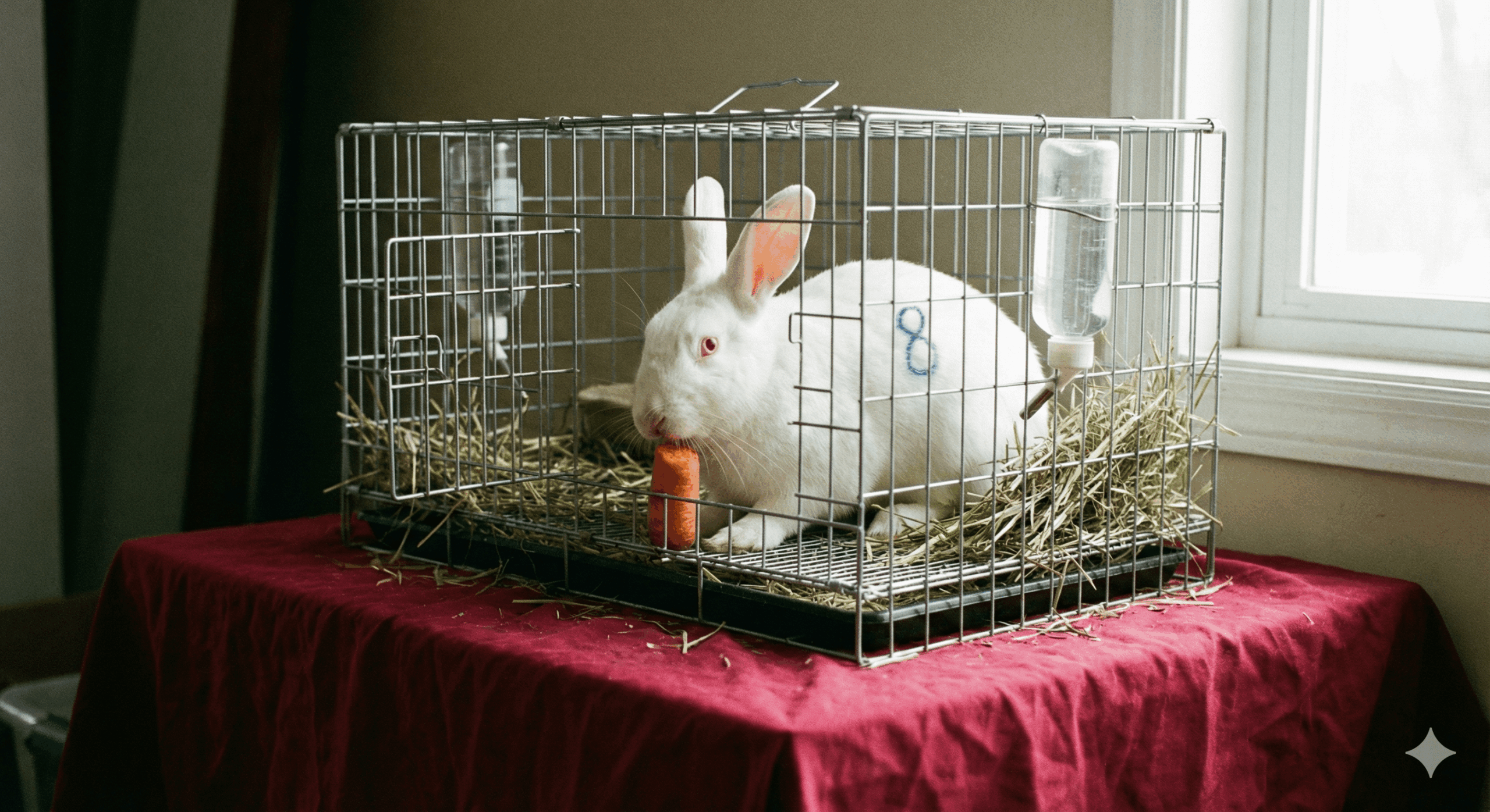 a table covered with a red cloth. On it is a cage the size of a small fish aquarium. In the cage is a white rabbit with a pink nose and pink-rimmed eyes. In its front paws is a carrot-stub upon which it is contentedly munching. On its back, clearly marked in blue ink, is the numeral 8.