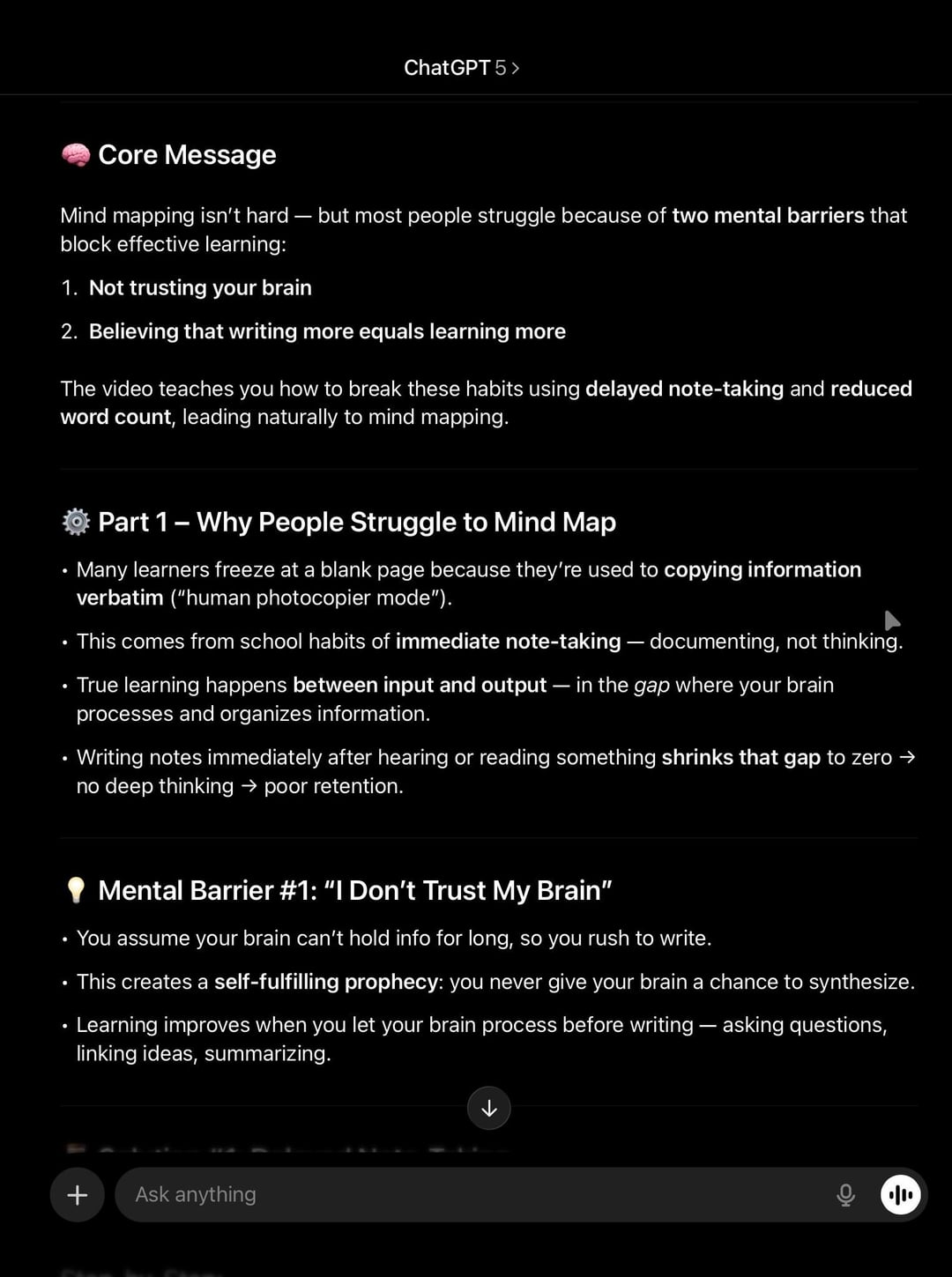 Prompt: “can you summarize and extract the key points in this video? Im learning how to effectively mind map”