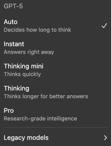 The latest GPT-5 upgrade introduced new ChatGPT modes: Auto, Instant, Thinking Mini, Thinking, and Pro.