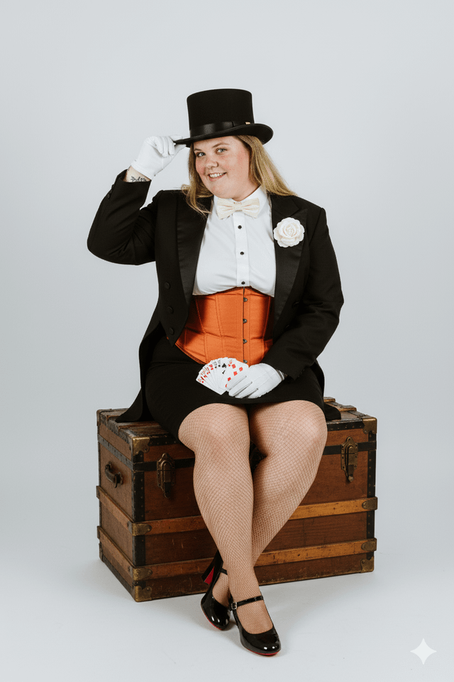 The subject wears a tailored black magician's jacket with wide lapels and black buttons, worn open to reveal a crisp white high-collared shirt with small black buttons, a cream-colored bow tie, and a fitted orange corset underneath. A single white fabric rose is pinned to their left lapel.